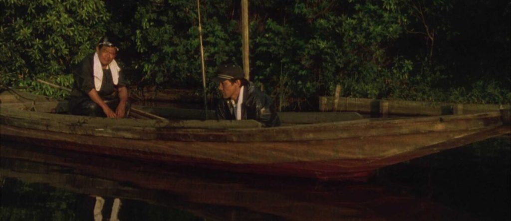 The exemplary scene that showcases Imamura’s brilliant, humanistic touch is the interaction between Takuro and Takada on a boat during sunset. Takuro is afraid the village’s people would reject and expel him if they discover he is a wife murderer on parole. His guilt triggers hallucinations and nightmares, and his unwillingness to move on turns him taciturn. However, after learning about Takuro’s past, Takada simply offers him a drink and starts talking about eels. The entire scene is shot in a single, long shot without any close-ups or sentimental music to emphasize this humanistic moment; yet, the human gestures and the painterly phragmites gently stroked by the wind convey a simple yet powerful wisdom that is deeply moving, even when captured from afar. The camera slowly follows the lateral movement of the boat, as if nothing is major in the context of the earth and the water. In this sense, The Eel does carry a similar idea to The Taste of Cherry: the testament of an individual against a vast landscape. What will happen next? Will he return? Who knows? We can only hope, but at least he was there.