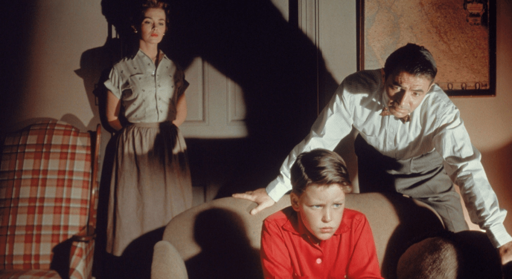 Nicholas Ray crafts a domestic theatre made of mirrors, staircases, and door frames. This is the fourth film I have seen from Ray, and every one of them has made me more invested in his oeuvre. His main characters always feel like they are being eroded by their decrepit emotional shortcomings. In Bigger Than Life, this inner motivation that literally drives James Mason into madness is the banality of the American middle class and Mason’s innate desire to escape it, to not carry any baggage, to return to his high school football ego-trip. The scene where the two men fighting breaks the staircases in the house has an intense physicality to it, because of how frequently Ray sizes the characters and frames them against this house that is the prison of materialism. It’s hard to compare anything with Johnny Guitar, but the use of CinemaScope here is absolutely gorgeous.