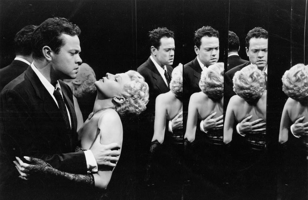 Welles’s demiurgical fable. See how he films the interiors of the courtroom: from an extreme wide angle looking down at everyone; he positions himself above the situation at hand, which contains ridiculous moments such as Mr. Bannister cross-examining himself. This pride continues until it finds Rita Hayworth at the stand, where Welles then films everyone using more tender close-ups; the style serves as a guiding hand towards Welles/Mike’s only point of vulnerability. The mirror sequence in the end is one of the greatest late-film adrenaline boosts – identities and projected presence become shattered. No matter how many times a physical body is reflected, its image remains the same.